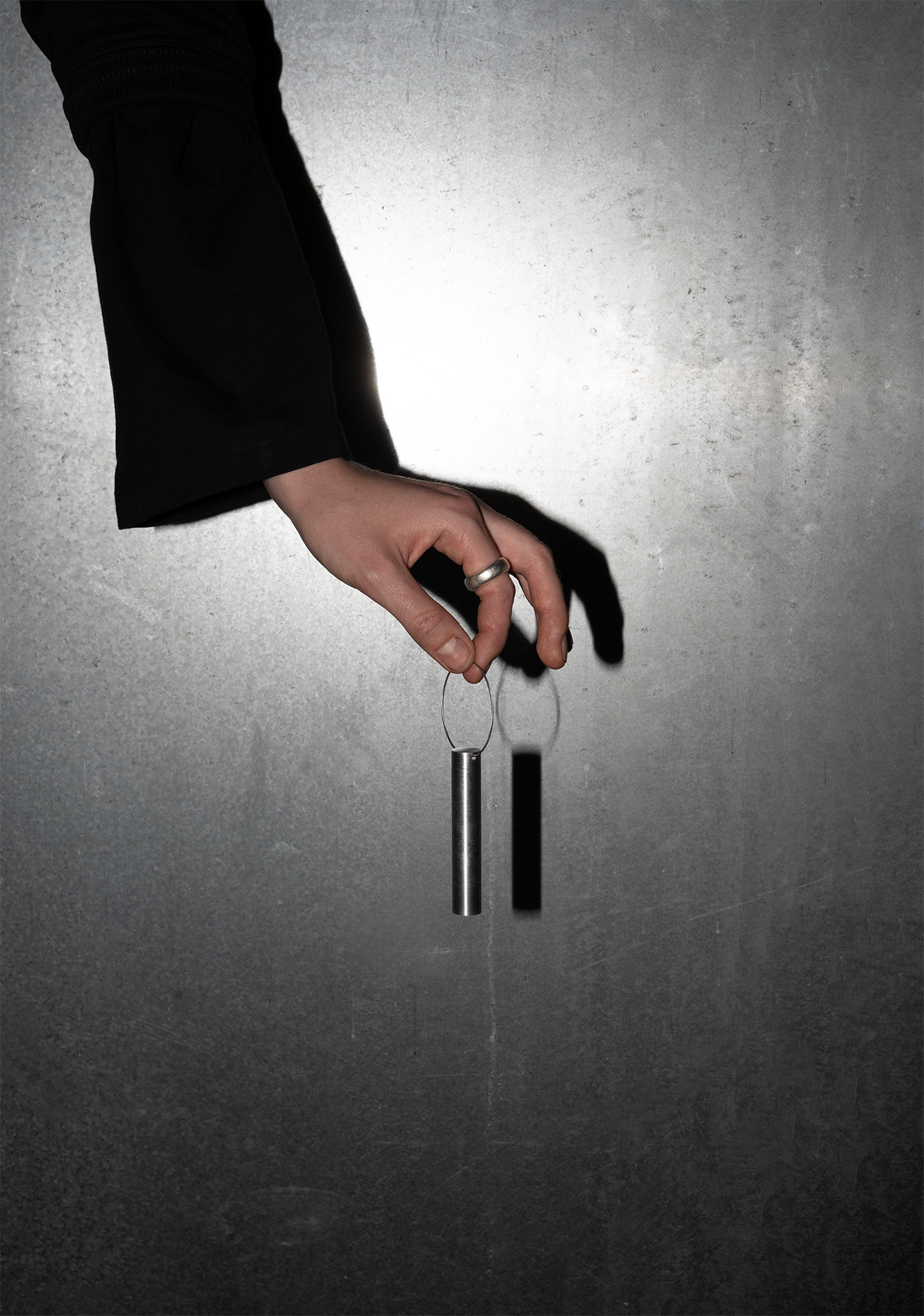 Die Signalfeife zieht sich durch eine Drehung am Gehäuse in ihre eigene Hülle zurück und verbirgt ihren Signalcharakter. Als in sich gekehrtes Objekt bewahrt sie die Möglichkeit des Alarms, ohne ihn auszusprechen.