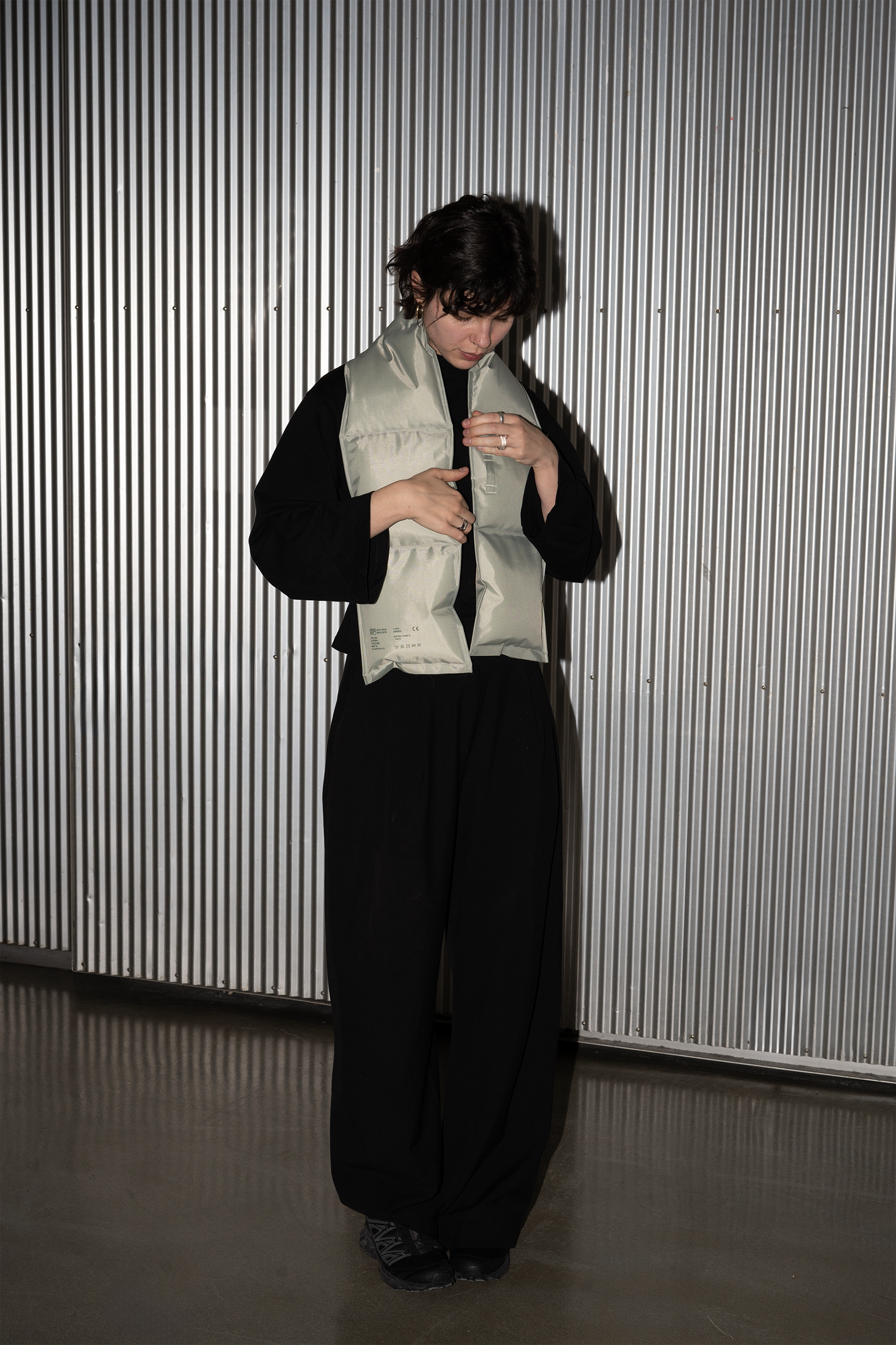 Die Weste ruht mit Glasperlen beschwert, spürbar und präsent auf den Schultern und transformiert die Schwimmweste von einem auftriebgebenden Schutzkörper in ein stilles, körpernahes Gewicht.