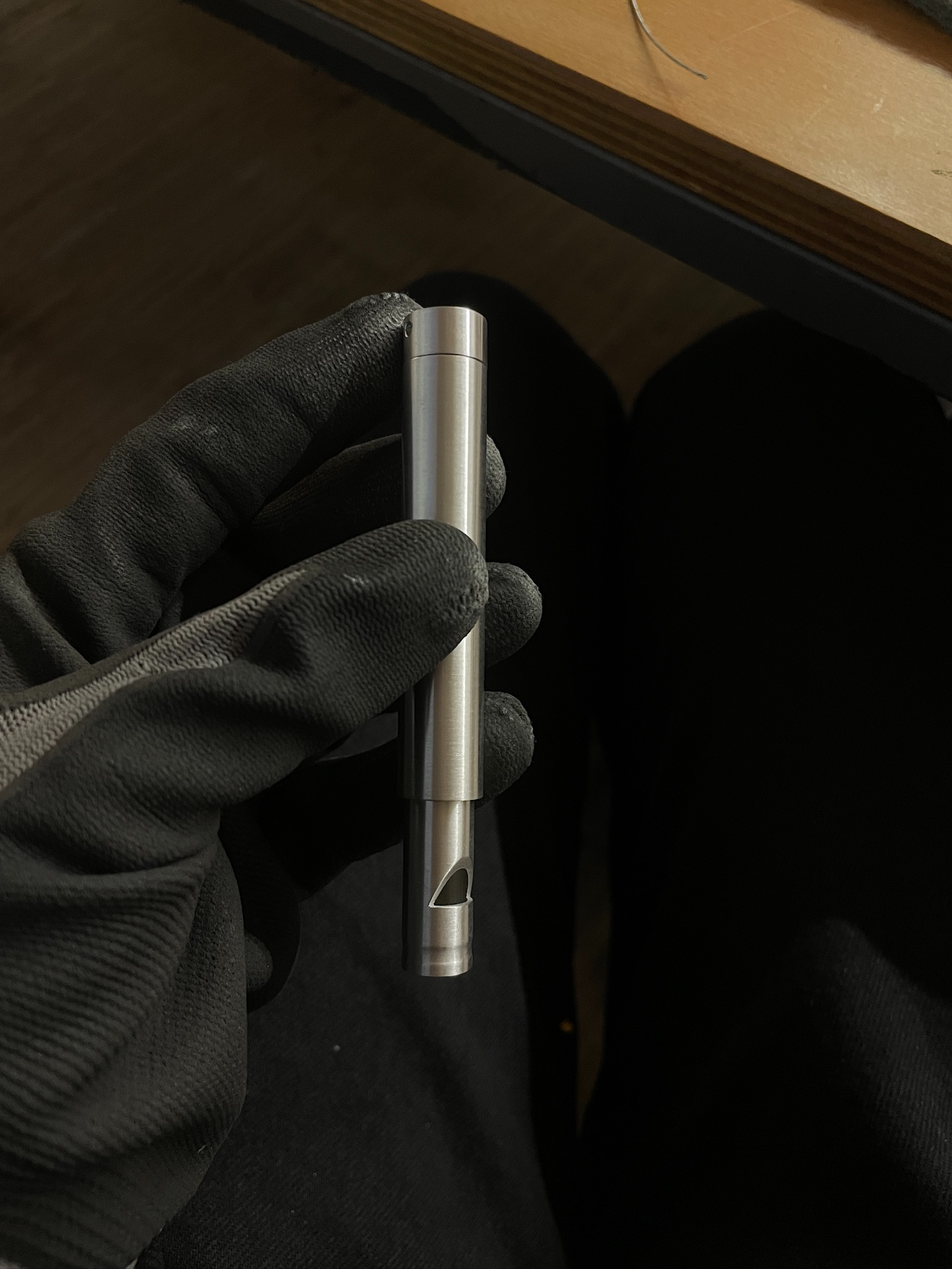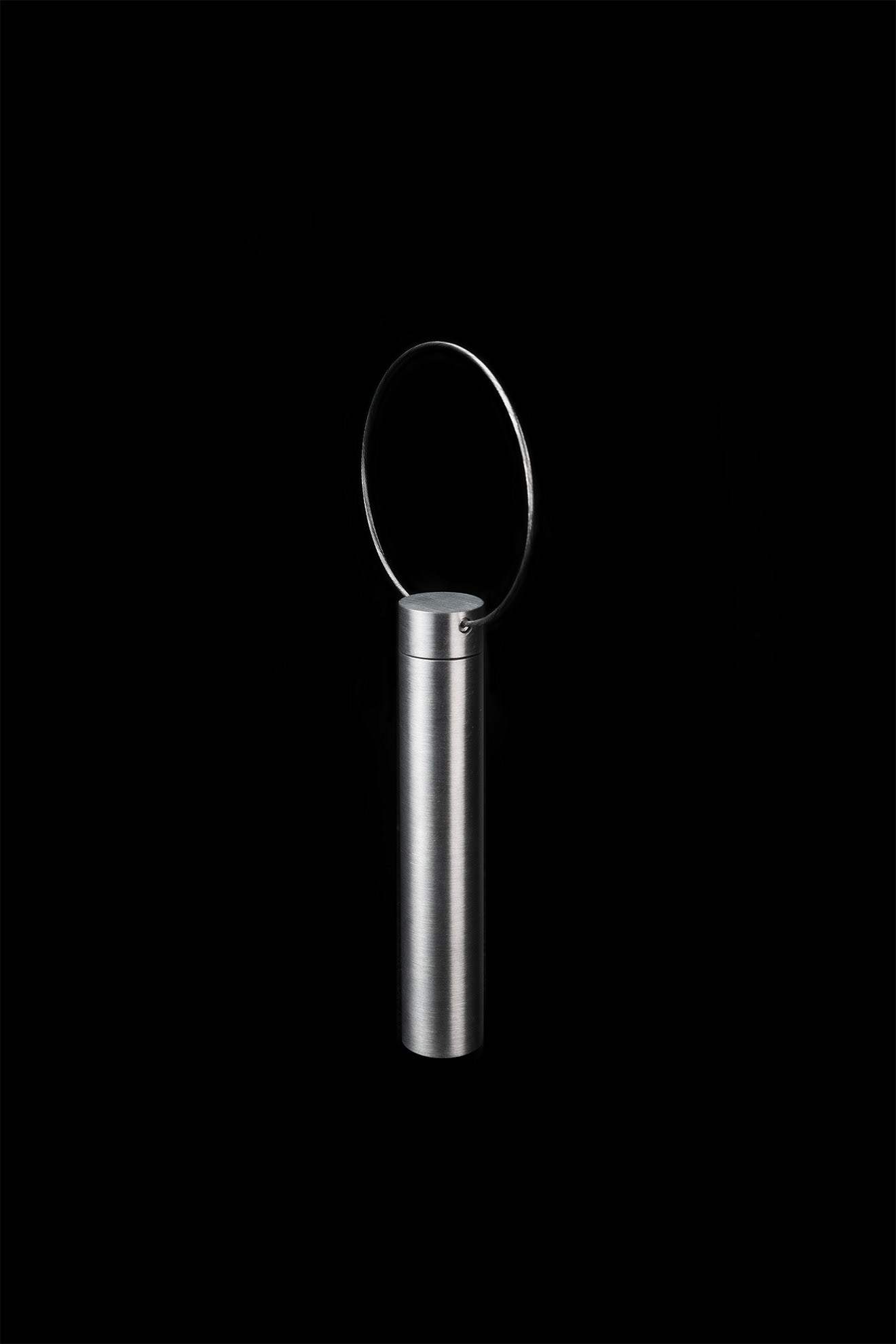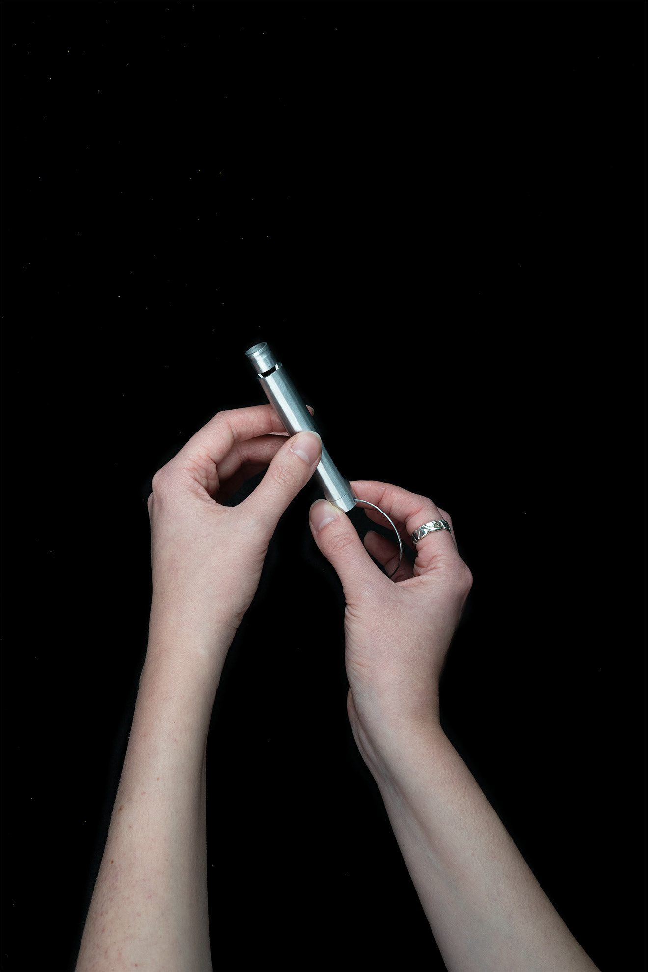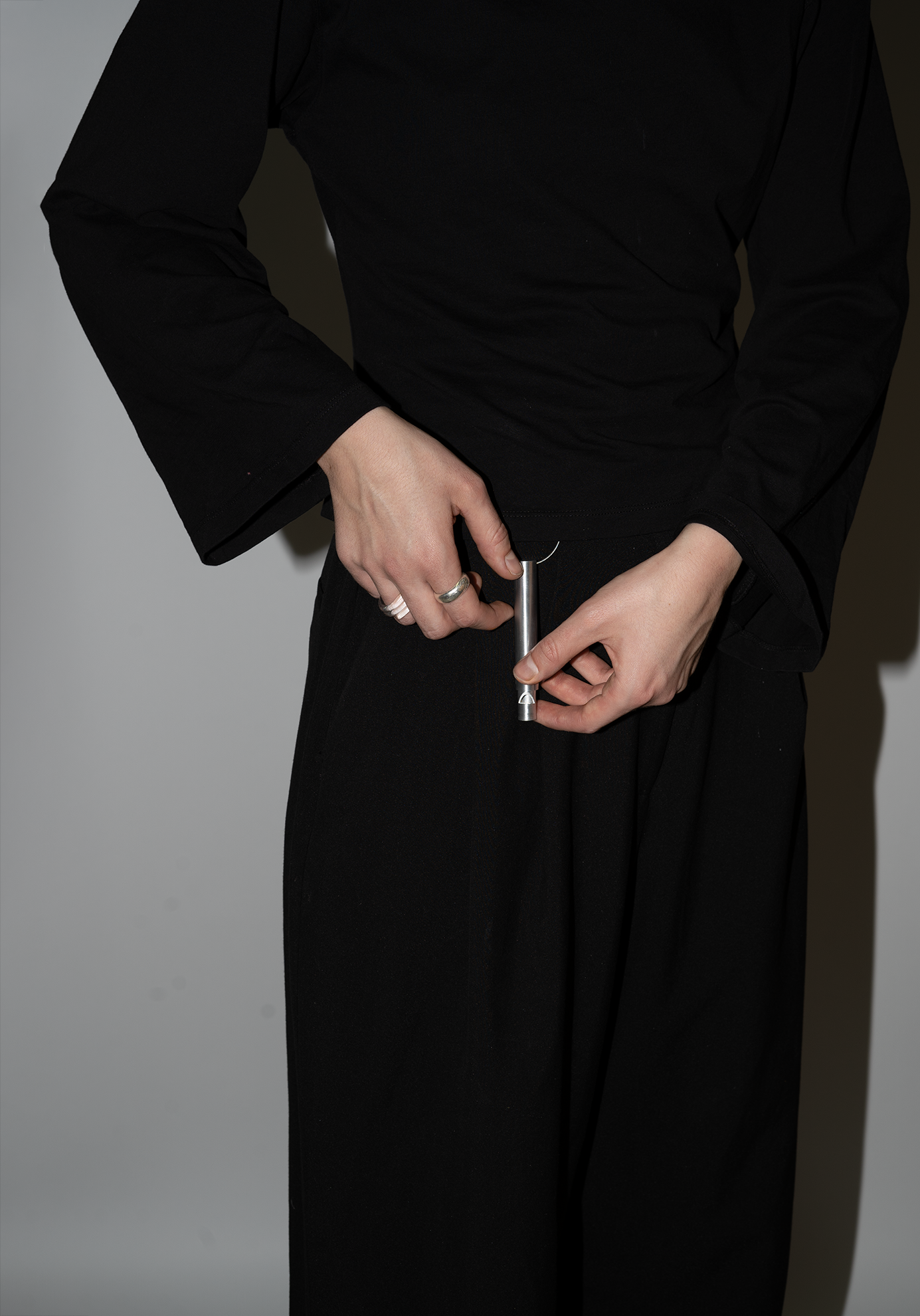 The signal whistle retracts into its own casing with a twist of the housing, concealing its signaling function. As a self-contained object, it preserves the possibility of alarm without voicing it.