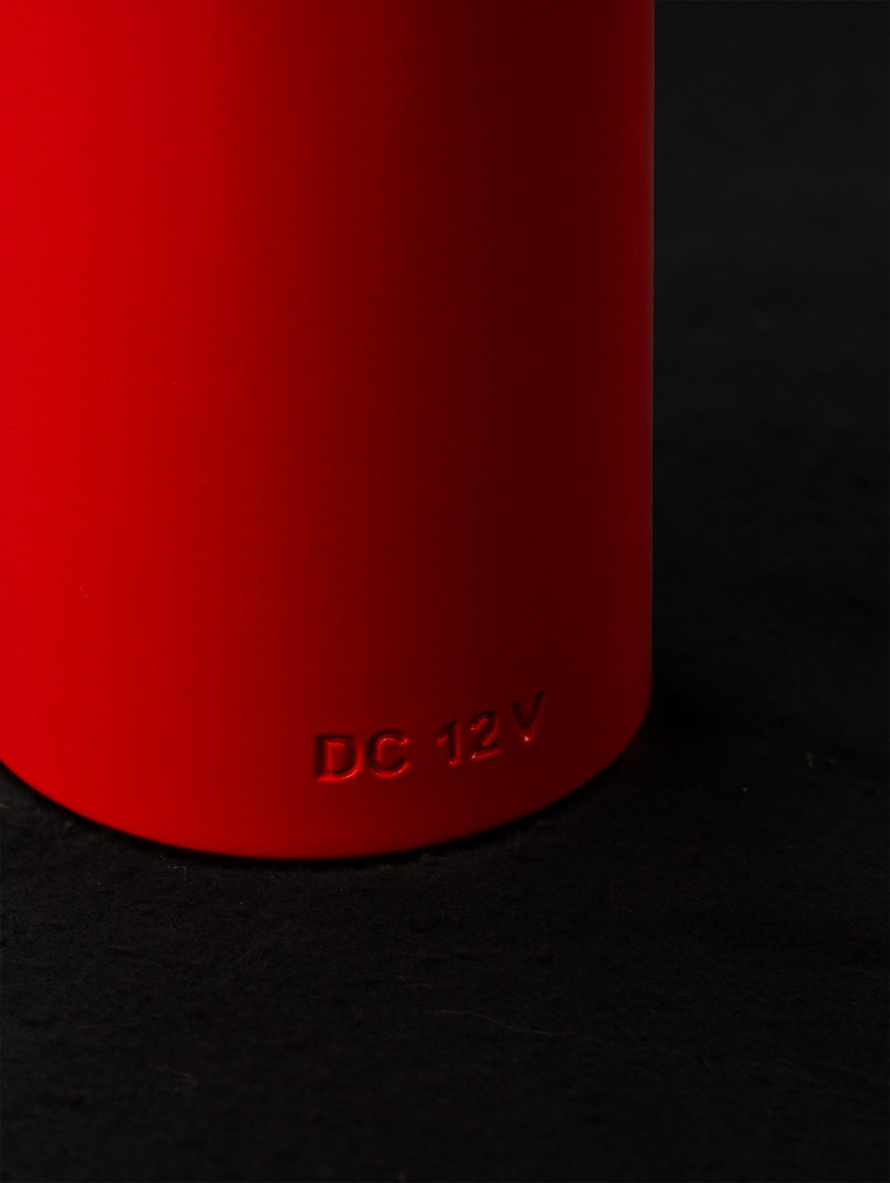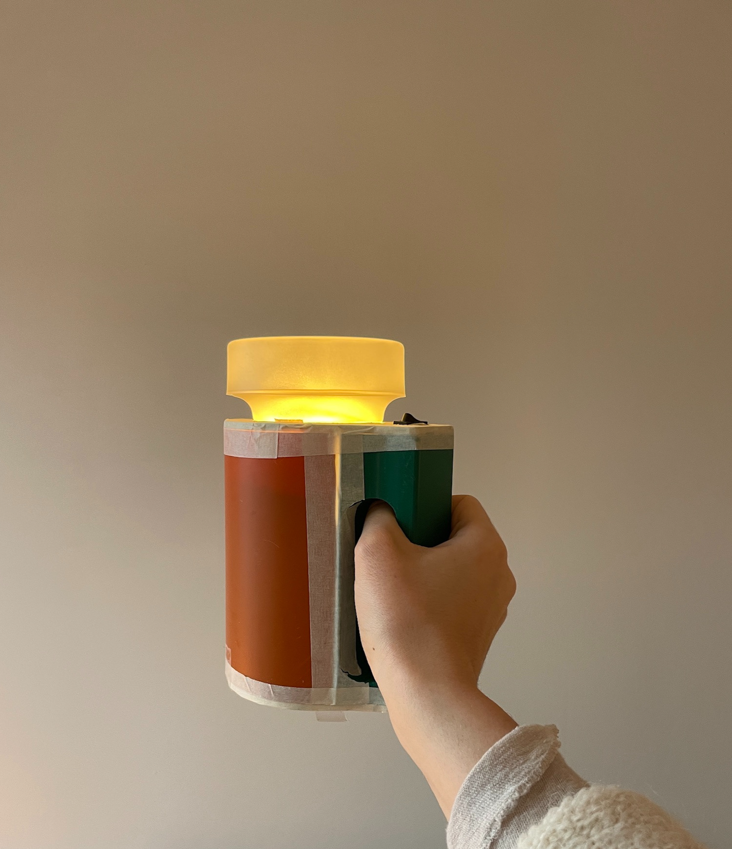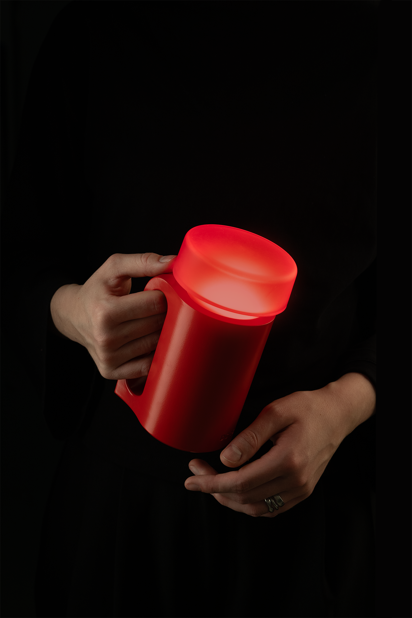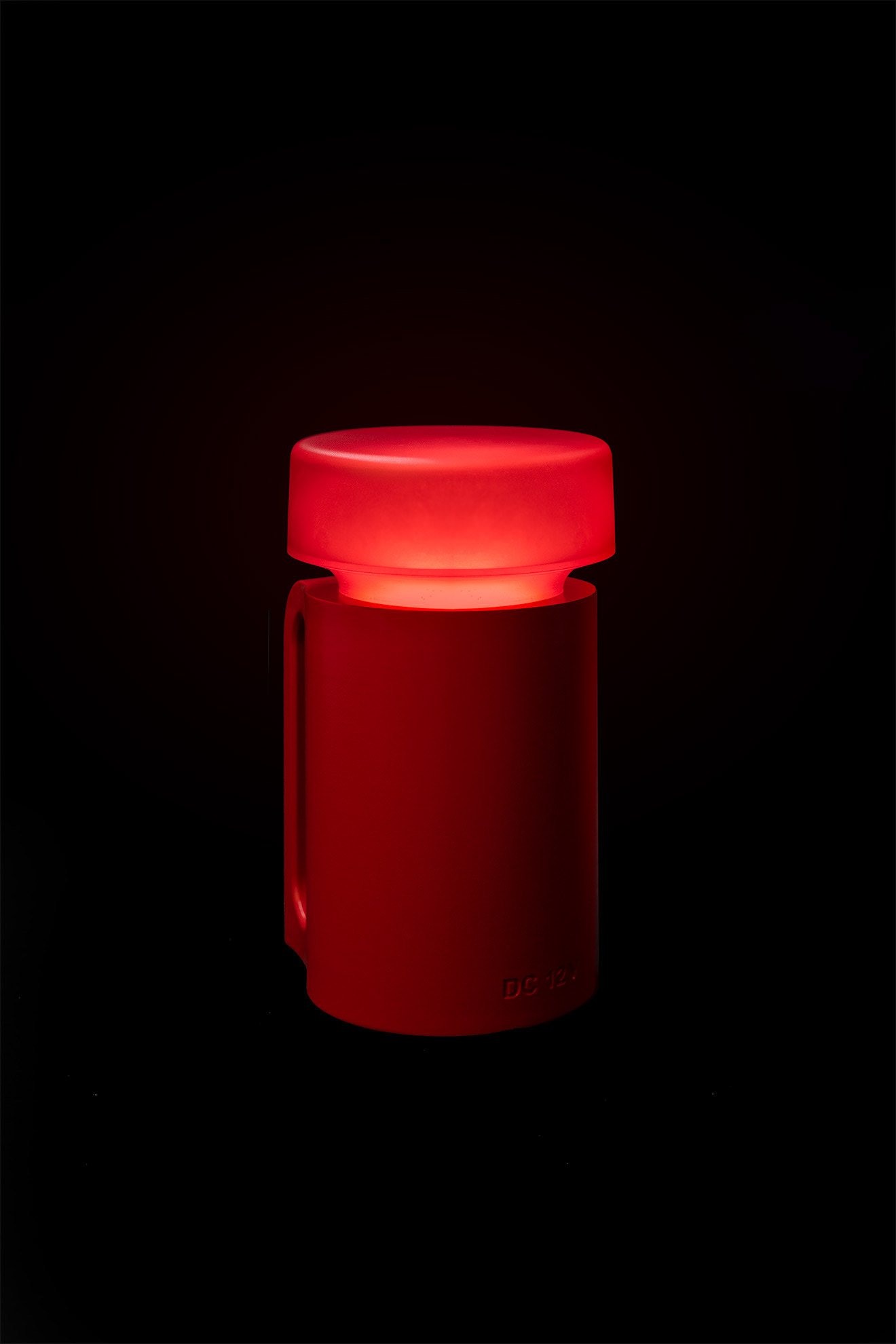 Die Leuchte erinnert, ruhig und atmosphärisch strahlend, in ihrer Form an eine Taschenlampe und entzieht dem Warnlicht seine Dringlichkeit. Als tragbares Objekt zwischen Gebrauchsgegenstand und Stimmungsträger setzt sie dem alarmierenden Aufleuchten ein sanftes, dauerhaftes Licht entgegen.